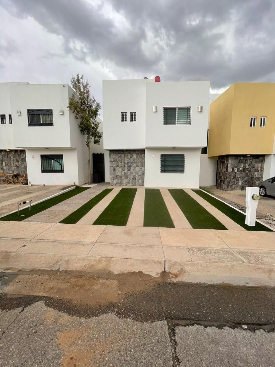 • 🏡 Fachada moderna con detalles en piedra y pasto sintético súper limpio 🌿